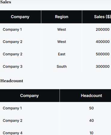 WHERE SALES.COMPANY = HEADCOUNT.COMPANY