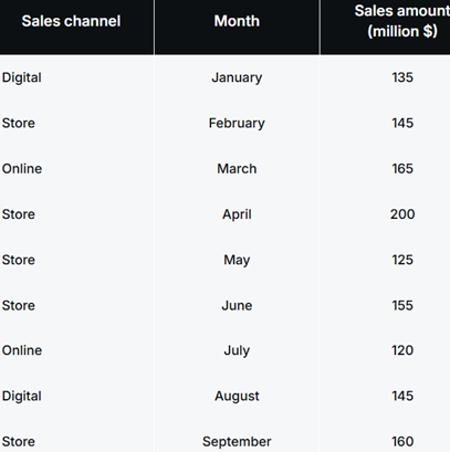 03. The sales department wants to include the composition of total sales amounts across all three sales channels in a report. Given the following sample sales table: